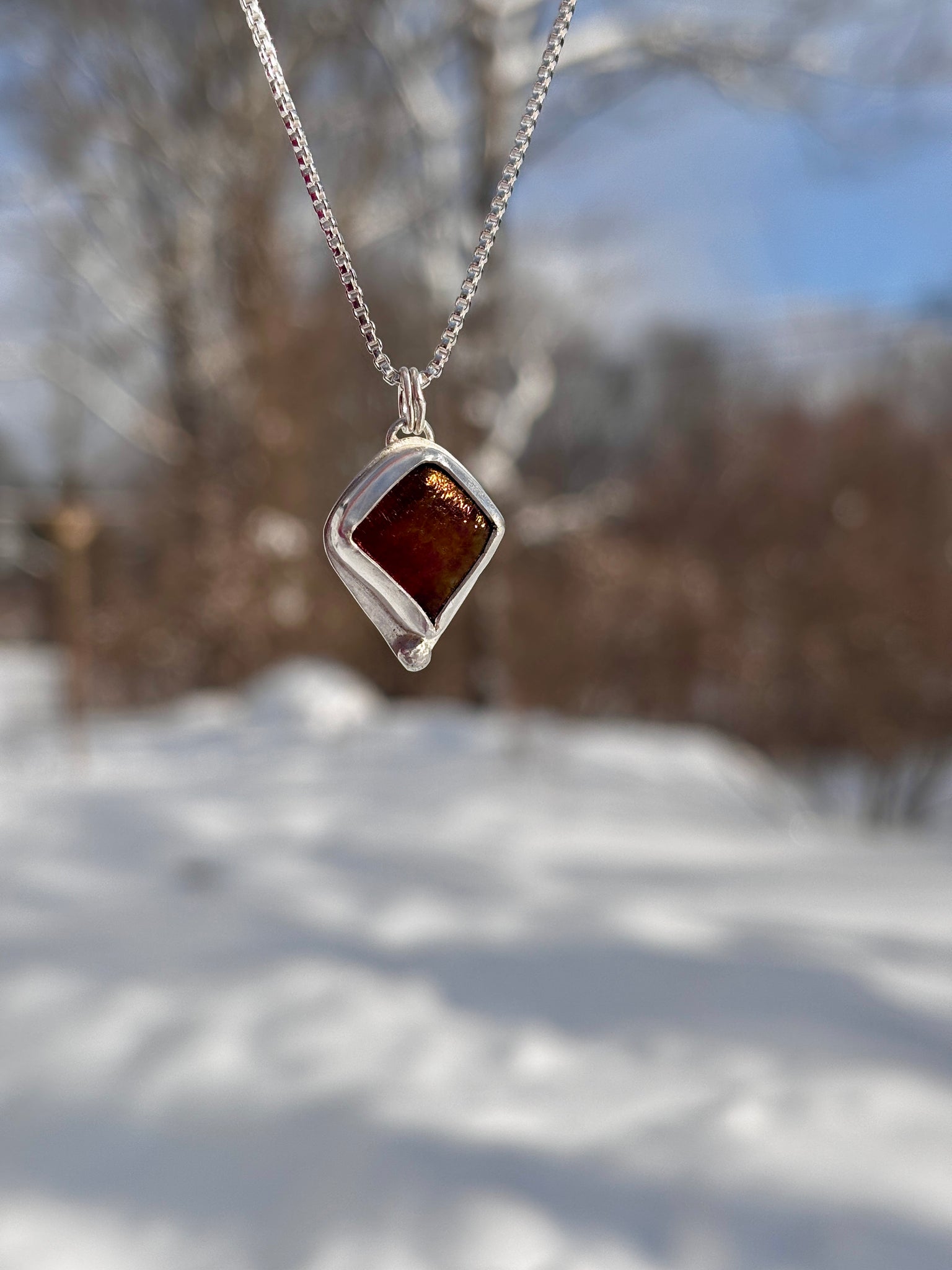 The red 'stone' was made in the studio from fused iridized red glass and surrounded in sterling silver.  It measures 7/8" in length and 5/8" wide and hangs from an 18" silver-filled box chain.